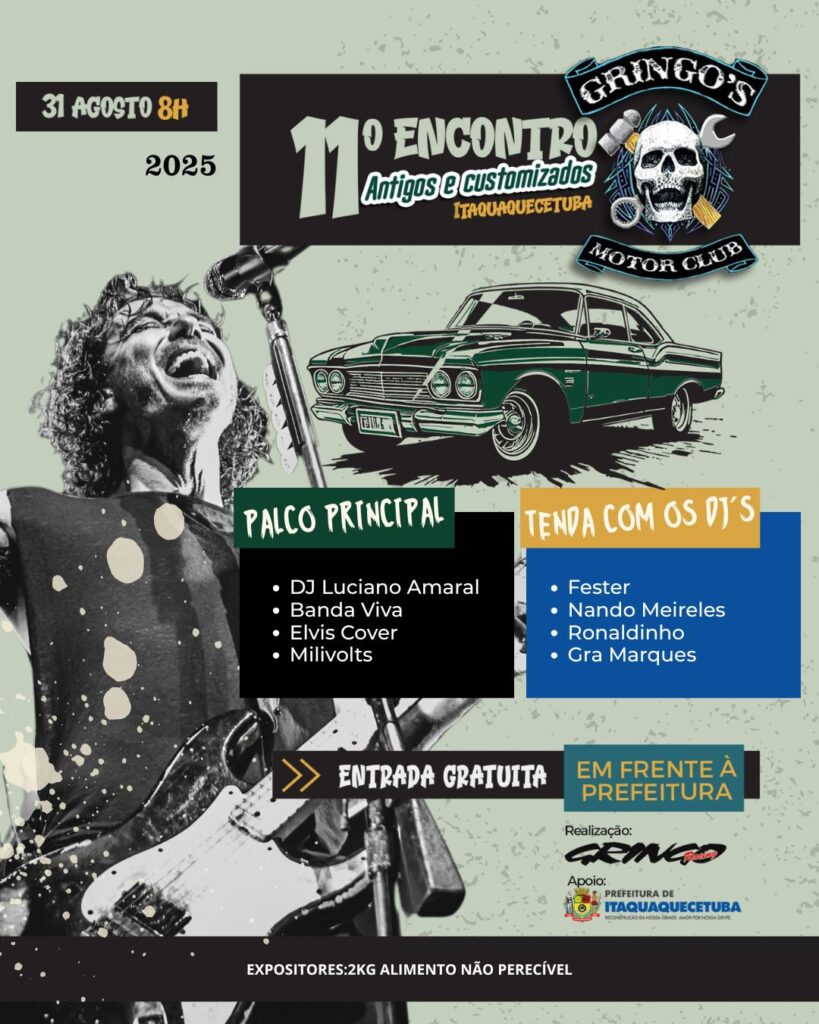 Neste domingo (31), Itaquaquecetuba será palco da 11ª edição do Encontro de Carros Antigos e Customizados, promovido pela equipe Gringo’s Motor Clube, com apoio da Prefeitura. Com expectativa de atrair milhares de visitantes, o evento que já integra o calendário cultural da cidade, reunirá exposição de veículos clássicos e customizados, apresentações musicais ao vivo.