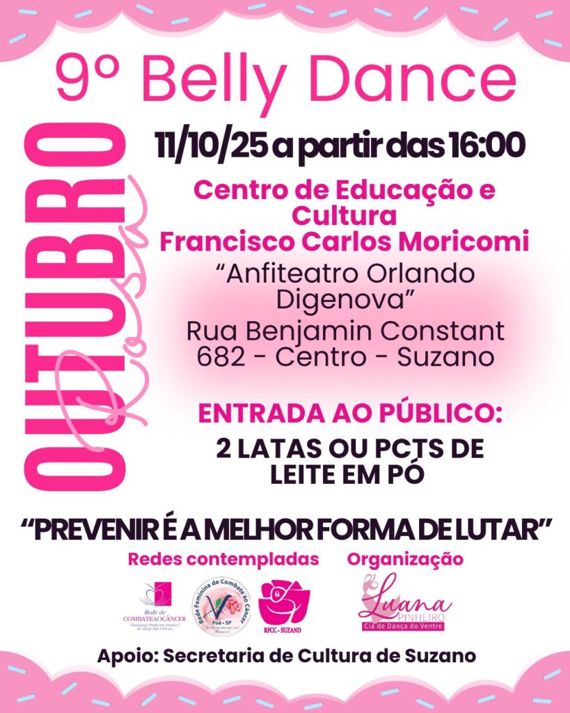 O município de Suzano recebe neste sábado (11), às 16h, a 9ª edição do Belly Dance Outubro Rosa com o lema “Prevenir é a melhor forma de lutar”, evento gratuito que reúne dança, cultura e solidariedade visando arrecadar latas, pacotes de leite em pó e gelatinas para redes de combate ao câncer. A iniciativa ocorre no Centro de Educação e Cultura Francisco Carlos Moriconi, no Anfiteatro Orlando Digenova.