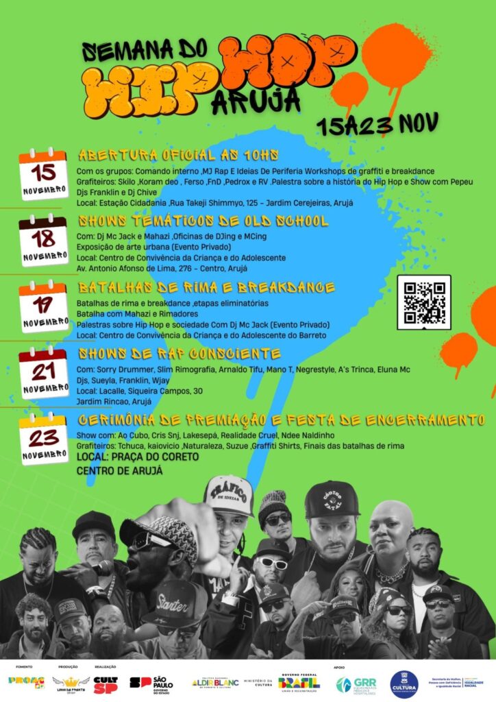 Arujá, cidade da região, se prepara para receber, a partir de sábado (15), às 10h, até 23 de novembro, a Semana do Hip Hop Arujá. O encontro promete movimentar diversos pontos da cidade com uma programação que celebra a arte e a música.