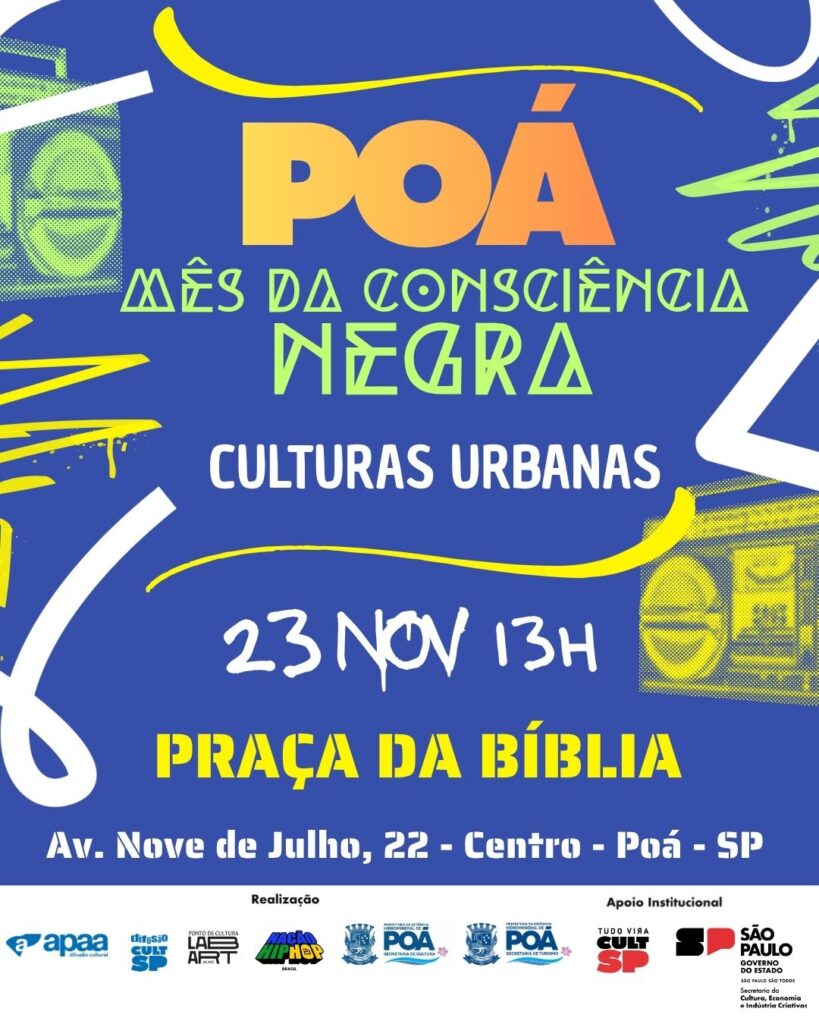 Poá sediará neste domingo (23), a partir das 13h, o festival Poá Culturas Urbanas, uma celebração das expressões artísticas das periferias e da cultura negra.