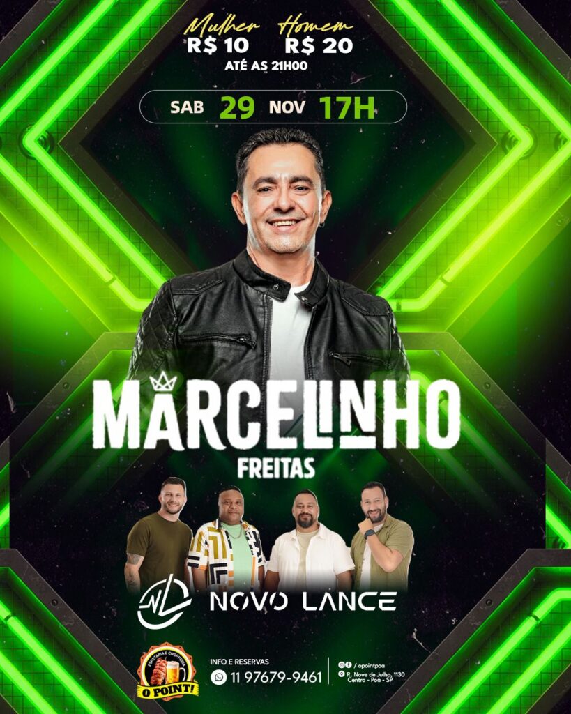 O bar e choperia “O Point”, localizado na avenida Nove de Julho, número 1130, na região central de Poá, promove neste sábado (29), a partir das 17h, uma noite de pagode com Marcelinho Freitas, ex-integrante do grupo Sem Compromisso, além do grupo Novo Lance. Até as 21h, mulheres pagam R$ 10 e homens pagam R$ 20.