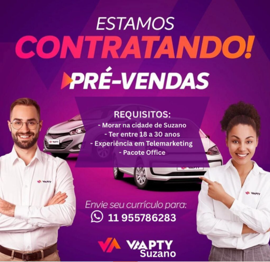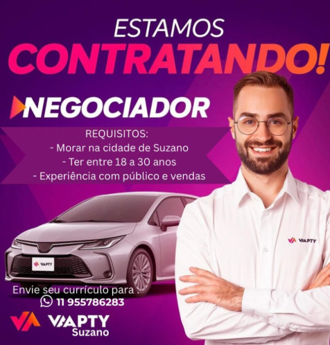 As unidades de Suzano da empresa Vaapty, localizadas na região central e na área do Jardim Revista, especializada em vendas de automóveis e que promete vender veículos em até 40 minutos, estão com vagas de emprego abertas para o setor administrativo, para o cargo de negociador e também para a área de pré-vendas.