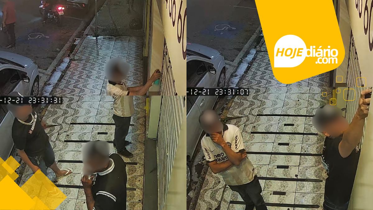 As imagens, captadas por câmeras de segurança, mostram os indivíduos chegando ao local e iniciando a pichação da porta do comércio. A ação ocorreu de forma rápida e durou poucos segundos, antes de os envolvidos deixarem a área.