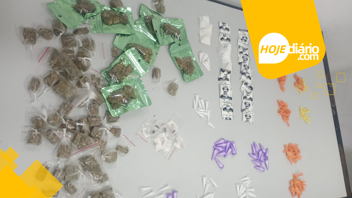 Os agentes localizaram uma sacola plástica preta escondida entre paralelepípedos contendo 68 porções de maconha, 77 de crack e 86 de cocaína.