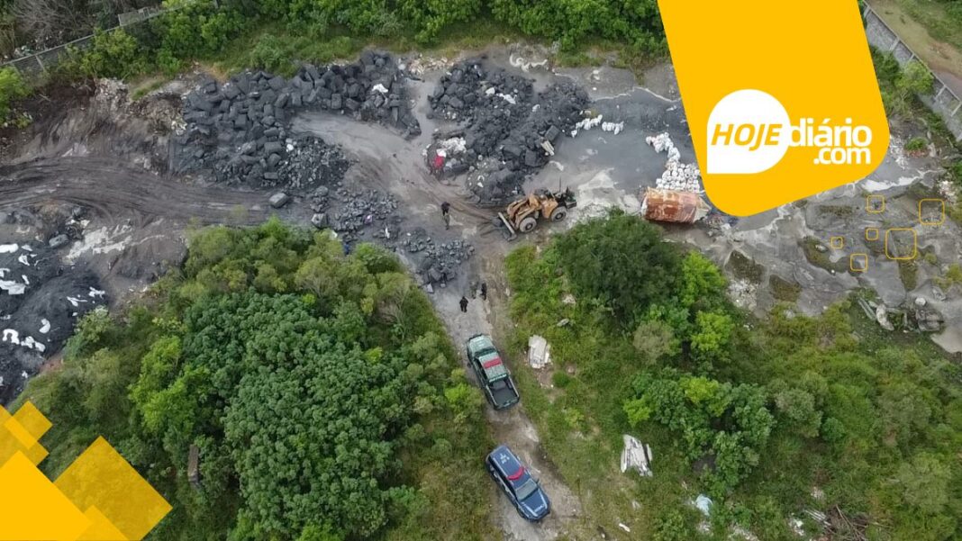 No local, foi identificada uma grande quantidade de materiais, aparentemente relacionados à extração de alumínio e prata, sendo descartados diretamente na área de preservação ambiental.