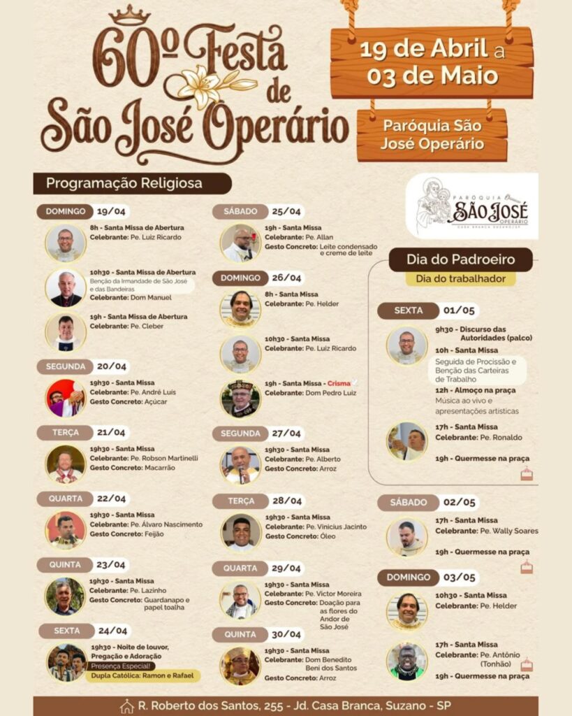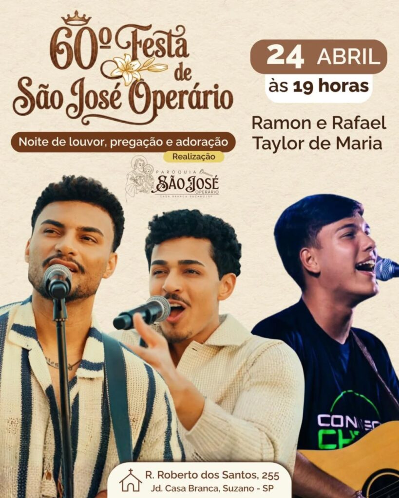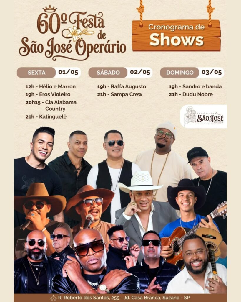 A 60ª edição da Festa de São José Operário tem início neste fim de semana, no domingo (19), no Jardim Casa Branca, em Suzano. Com entrada gratuita, a programação será realizada na Paróquia São José Operário, na rua Roberto dos Santos, número 255, e se estende até 3 de maio, reunindo uma ampla programação religiosa e artística, com muita música, além de ações culturais.