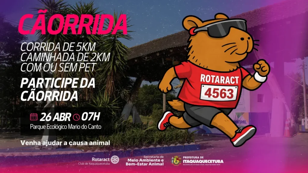 A Prefeitura de Itaquaquecetuba, por meio da Secretaria de Meio Ambiente e Bem-Estar Animal, apoia a realização da Cãorrida 2026, evento que combina atividade física e conscientização sobre o cuidado com os animais. A programação está marcada para o dia 26 de abril, no Parque Ecológico Mario do Canto, com início às 7h.